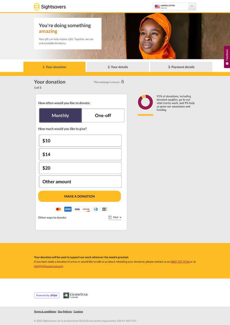 - Trust Signals: The organization reinforces donor confidence by displaying recognizable trust signals, like the secure payment icon and Stripe and GuideStar logos. It provides clear contact information, including an email address and phone number, so donors can easily reach out with questions or concerns. At the bottom of the page, supporters can see that Sightsavers is officially recognized by the IRS as a tax-exempt charity under section 501(c)(3). The foundation provides its Employer Identification Number (EIN) as well so donors can verify its legitimacy.